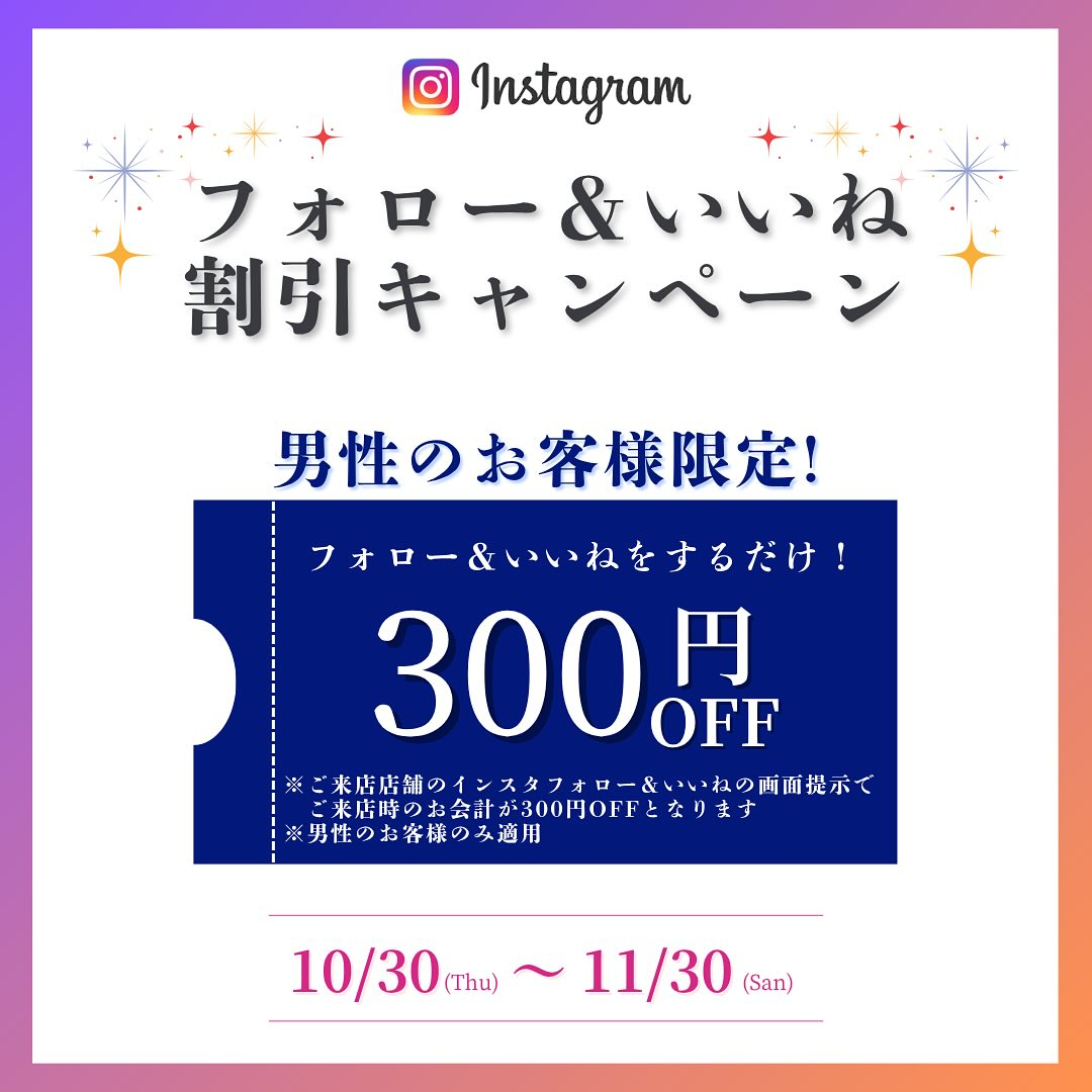 インスタフォロー&いいねでお会計が300円OFFキャンペーンを開催いたします💖